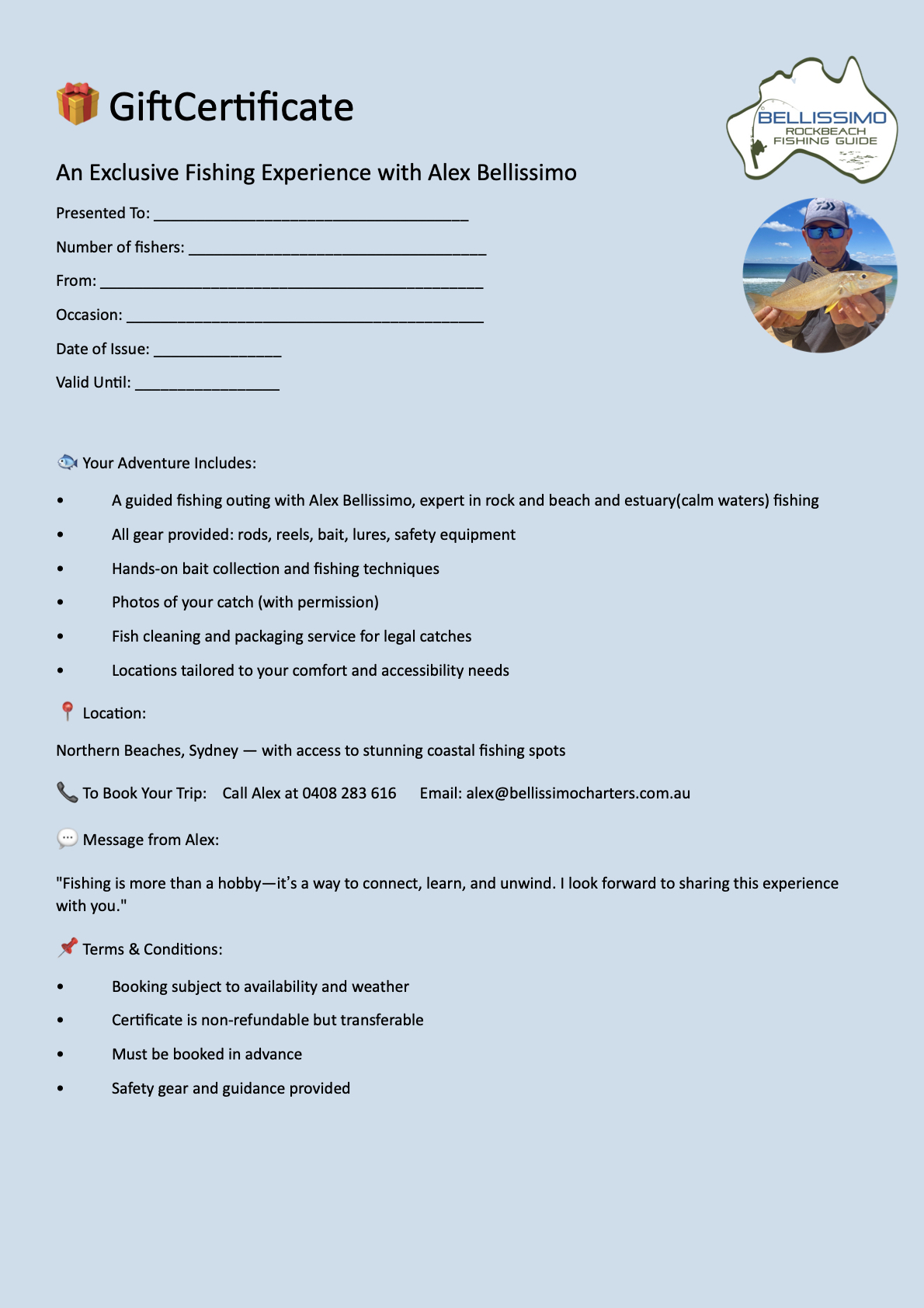 CALL NOWALEX BELLISSIMO FISHING ADVENTURE VOUCHERS